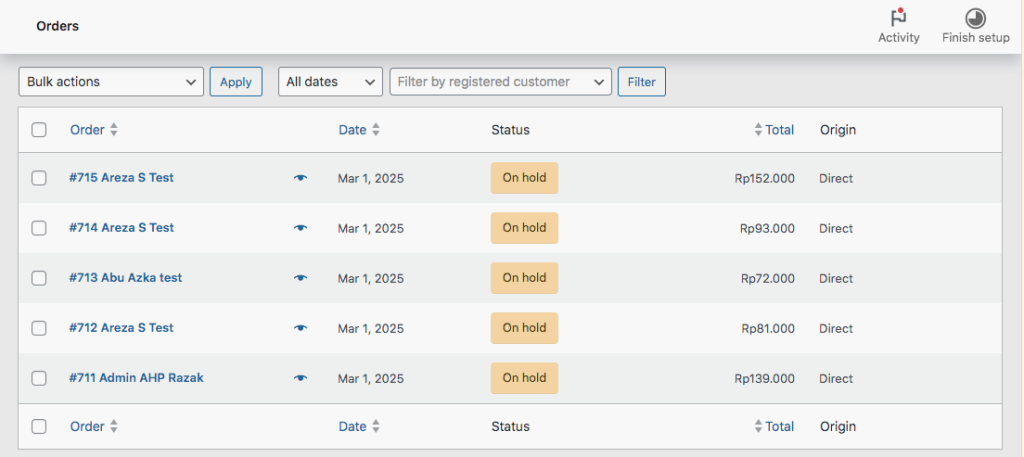 Di dashboard, navigasikan ke WooCommerce > Orders untuk melihat semua pesanan yang masuk.